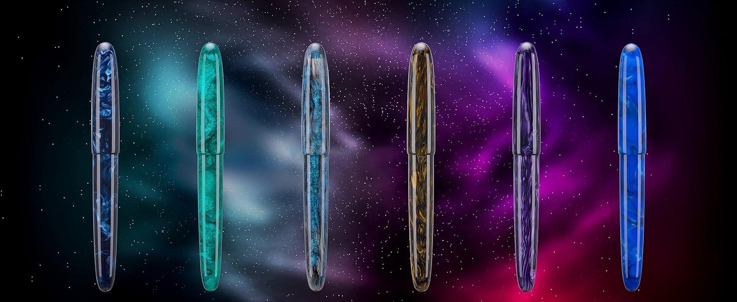 I am a big glitter fountain pen fan, so I picked up the light blue glitter C80 with an EF nib. I'm kinda bummed the brown pen isn't a glitter style; I would've snatched that up immediately, same with the purple. I'm not quite feeling the "ripple" colorways, but I'm going to seek out more pictures and videos for them, in case they can change my mind.