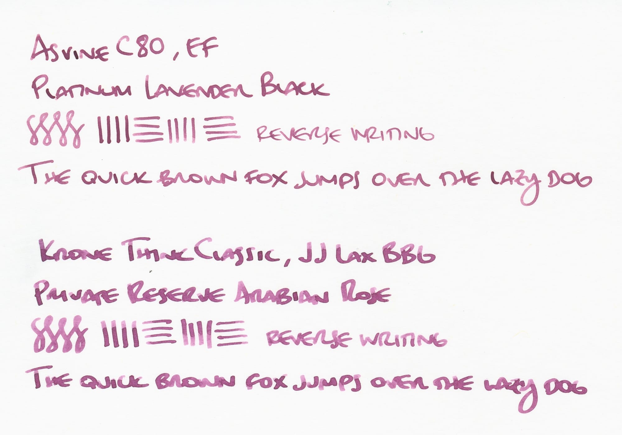 Even so, I do like the dusky, dark rose color Lavender Black is in reality. And from the nice EF nib in the Asvine C80, it looks great.