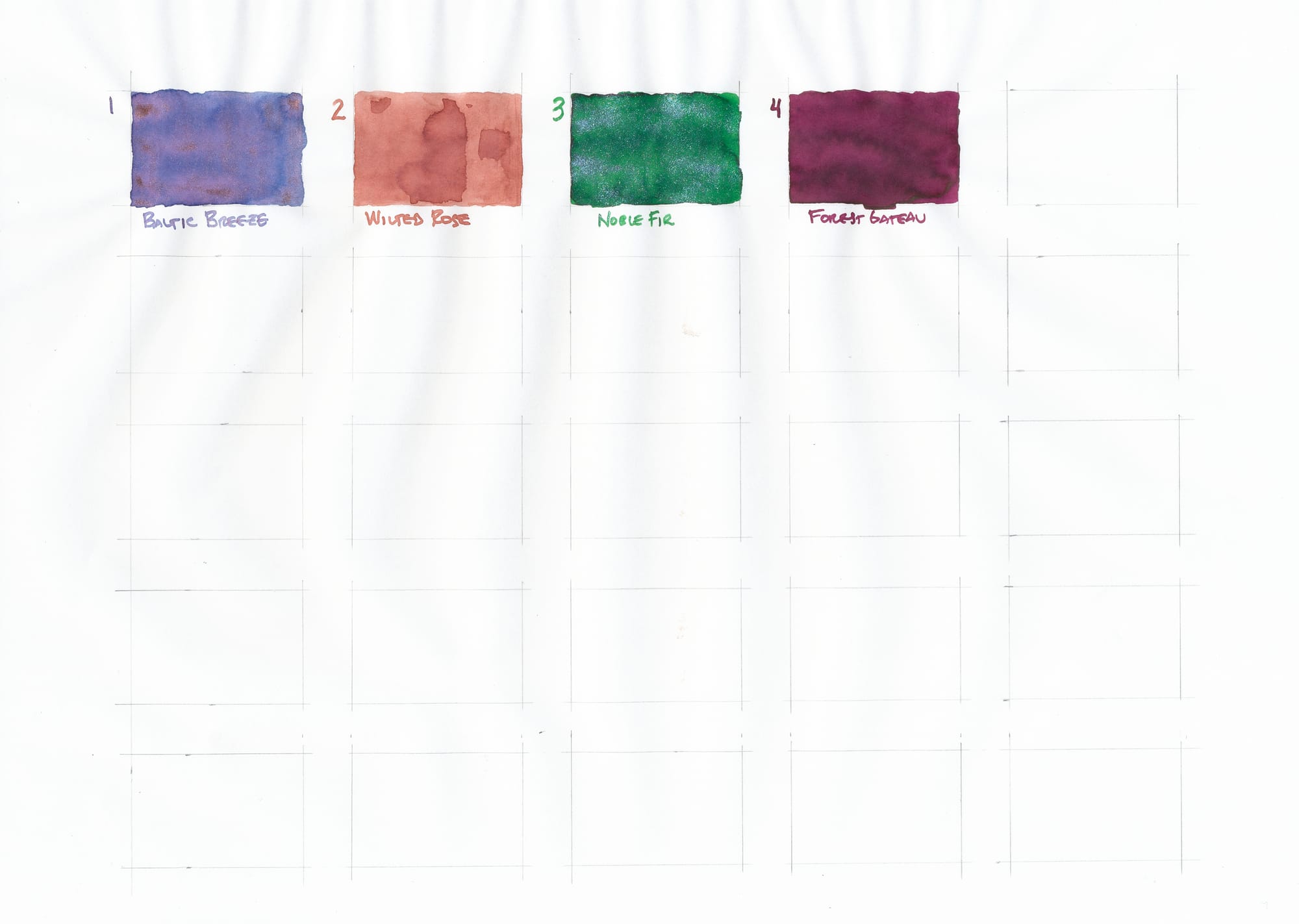 Baltic Breeze is a nice purple-y blue with bronze shimmer, but when writing out its name on the swatch card, the shimmer was not consistently distributed. The base color on its own appeared a bit too light at times. Perhaps in a good broadish-medium or broad nib the shimmer and base color will look better.