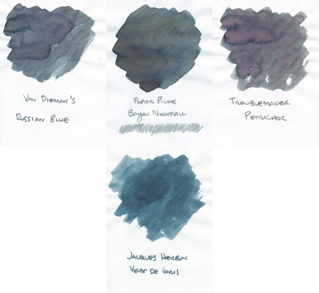 I don't have too many greenish-grays in my collection, but I picked out 3 inks to compare: Troublemaker Petrichor, Van Dieman's Russian Blue, and Herbin Vert de Gris (more of a similar color family pick).