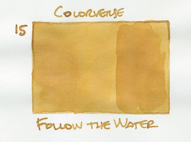Follow the Water is a weird ink, but not necessarily in the way that appeals to my love of weird inks. My initial reaction was that the ink looked like dirty, muddy water in the sample vial, and it inexplicably had aqua green iridescent shimmer? I felt like they were trying to emulate the cool quirkiness of Diamine's Nostalgia, which was a sepia brown base with red/magenta shimmer, even though they couldn't have known about the combination. I didn't really like the combo for Follow the Water because while the base did dry down to more of a golden wheat yellow, it still was close to a sickly yellow shade I don't like (the scan looks better than how it looked to me IRL), possibly because of the aqua shimmer adding some greenness to the base.