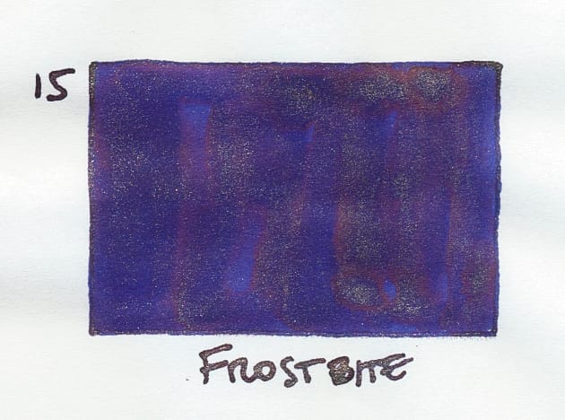 Frostbite is fine. It's pretty on the nose for the winter/holiday theme, which is also fine...but the thing that I'm tired of is the combo of a blue base, red sheen, and some shimmer – in this case, a bright, champagne shimmer. We already saw that combo in Celestial Skies on day 1 (even though the base is more teal-ish), and there's always one of these inks in the Inkvent sets (IIRC). And even Colorvent from day 6 had a bright blue with red sheen ink. No shimmer, but still, 2 out of the 3. 😝 Yes, the darker, somewhat purpley blue and the bright champagne shimmer set each other off well, but I personally am just over this combo of colors and attributes... 🤷♀️ It's fine.