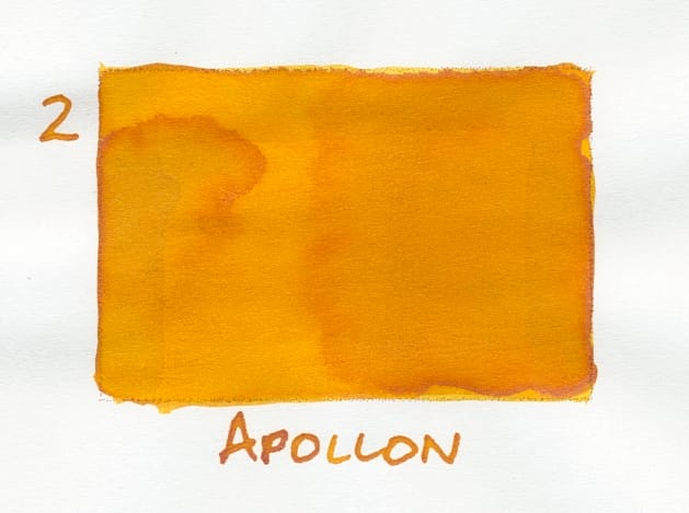 My second favorite ink in the batch is Apollon. It's a nice orangey-yellow, sunshiny, and quite legible from the jump. It looks like it'd be a nice counterpoint to the more subdued colors in my currently inked pens.
