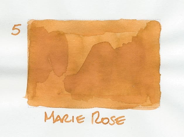 The very bright gold label on the bottle for this ink piqued my interest from the start. I didn't know what Marie Rose referred to, but I was happy to see it was a standard ink. Upon swatching, it looks like a peachy golden color. The scan looks a little bit flat compared to how it looks in real life. I'm not normally a fan of peachy colors, but this one looks nice with the yellow (and brown?) tones. Apparently Marie Rose is a British sauce, like a fry or burger sauce. And the color of the ink mimics the sauce color, which at its simplest could be mayo and ketchup.