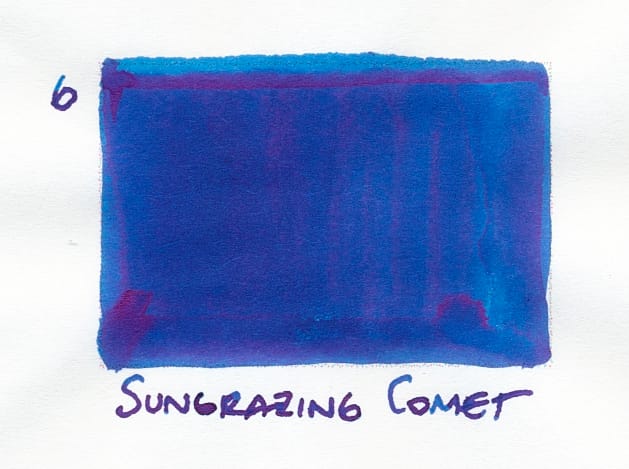 This is an alright sheener. We've seen this kind of medium-bright blue with red sheen many times before. It kind of looks similar to the base color of Diamine Arctic Blast which was one of my favorite inks from the first Diamine Inkvent I bought (green). Considering I'm not a huge sheening ink fan, I think this low-key sheener would be one I'd use over the more obnoxious ones. I like the resulting color from the base mixing with the sheen. It's fine.