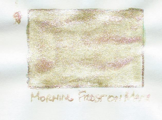 But when I swatched the ink, everything kinda went wrong. The ink looked like it clung well to the Kakimori glass nib I used, and the first couple strokes to outline the swatch rectangle went okay, but then it's like the ink had completely dried and the glass nib wouldn't write until I dipped again, which caused clumping. I tried to write "9" for the day number twice, but it just blobbed as soon as I touched the nib to the paper. I barely was able to write the ink name below the swatch rectangle. I was concerned that the ink was like a pigment ink that would aggressively cling to my swatching tools, so I rinsed off the glass nib immediately. Luckily the ink and shimmer cleaned off easily under running water. I used my folded nib to do the swatch, and you can see below that it didn't look that great.