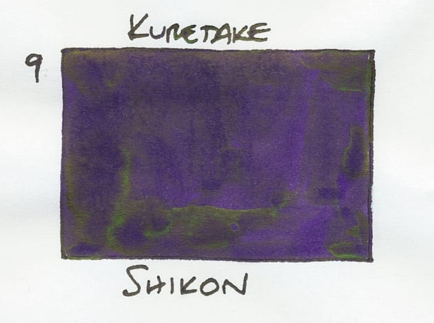 Kuretake Shikon is a very dark, grapey purple with green sheen. It immediately reminded me of Lamy Dark Lilac, but probably the new version; I think the original had golden sheen somehow? I have a sample of the new version but haven't played with it much since it's so dark and the sheen completely overwhelms the base. In the writing sample, the same thing happens with Shikon, unfortunately. Such a bummer that green is the typical sheening color seen with purple inks. They don't go well together as far as preserving or augmenting the base color. At the very least, I like that I'm experiencing more of a brand that's new to me. I'll have to look at the rest of Kuretake's line up sometime.