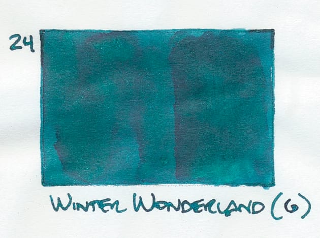 Colorvent ended on day 24, so only 3 inks in this "week". I actually am not a fan of any of these. Sojourner, as I mentioned in my post for Day 22, is a very dark version of Sailor Yurameku Date Gokoro. But because it doesn't have that ink's nice translucency and chromoshading, I don't like it as much as the Sailor ink. And by the time day 24 came around, I was pretty "tealed out" thanks to other teals from Colorvent and Inkvent, so I wasn't that interested in Winter Wonderland. It does remind me of Wearingeul Wayfarer, which I used to like. Winter Wonderland is pretty, but I probably won't use it much, unless my dislike of teal changes. Overall, none of these inks really appealed to me, which was sort of disappointing for the end of Colorvent, especially since it started out stronger than Inkvent did, seemingly.