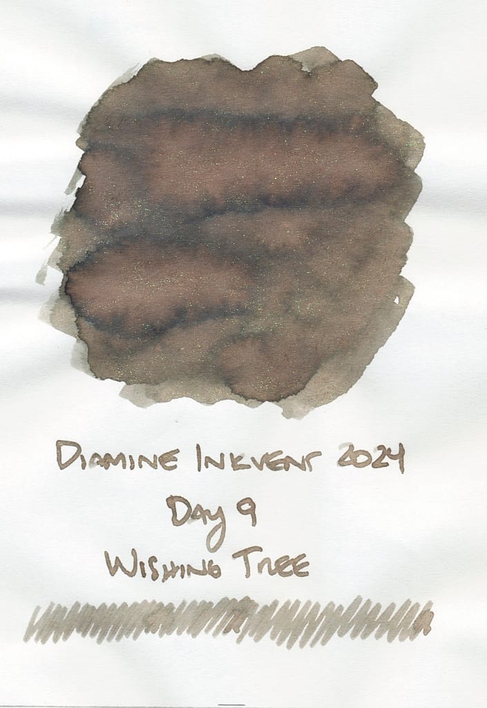 Finally, Diamine Wishing Tree from last year's Inkvent has a similar look, but its base color is a warmer green-gray with brown tones. It has a chameleon shimmer that appears to shift between pink and green like Fir & Fog's. So if you want a warmer version of Fir & Fog, maybe try Wishing Tree.