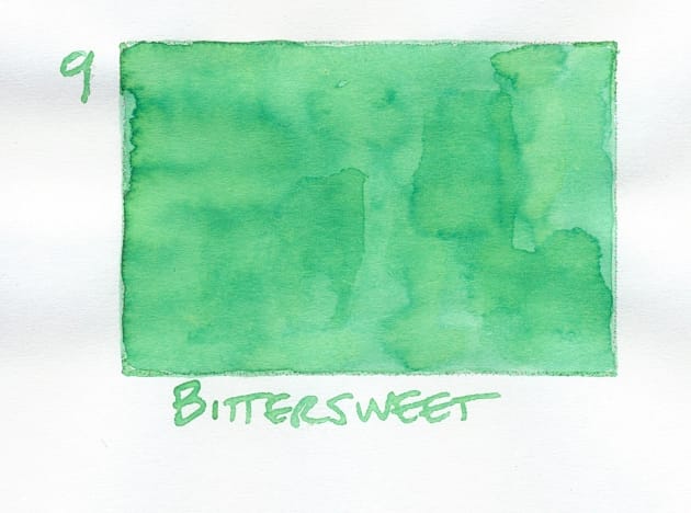 Nostalgia wins week 2 Diamine Inkvent for me, with its eccentric combo of a sepia base color and magenta chameleon shimmer. Bittersweet is the nostalgic (ha) runner up because it totally reminded me of Andes mints with their shiny green wrappers, one of my favorite chocolates/candies. Second runner-up is Bubbly, a great champagne-colored shimmer. Honorable mention goes to Brrr! for its fun name and nice icy blue color, even though I'm wary of it, due to pigment inks being harder to clean out of pens.