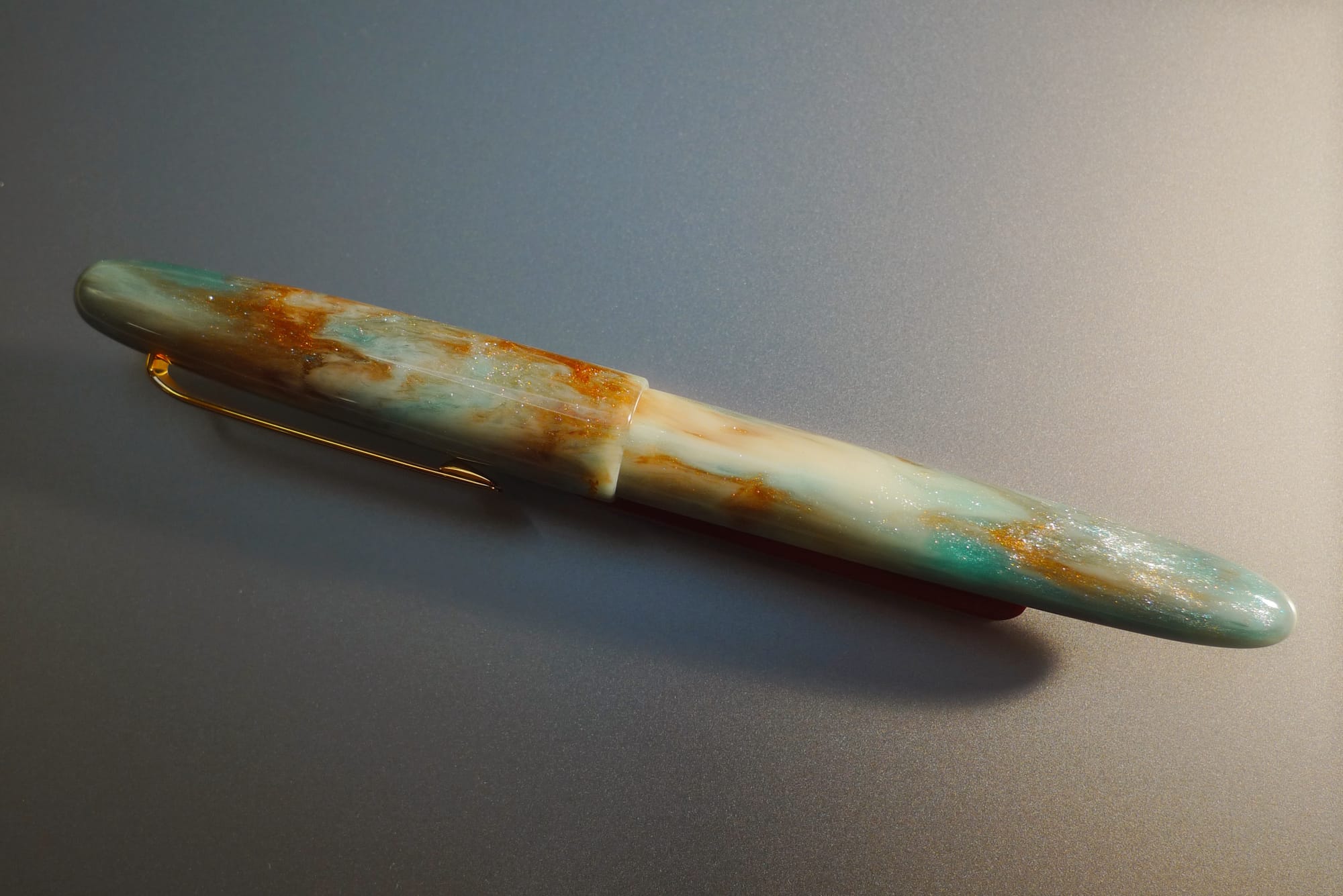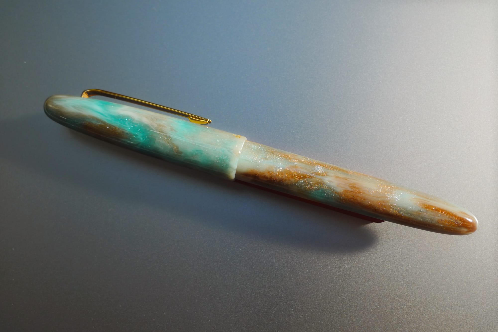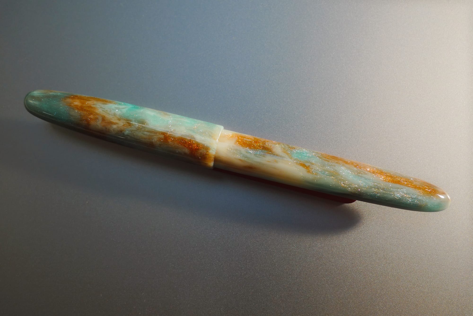 When I found the glass nib dip pens with a little orange cat on the end, I also saw some Esterbrook Esties in the display case, and a couple of them caught my eye. One, marked "RB" was in the Sweet Dreams resin, and the other marked F was in an unknown creamy blue-green, copper, and white sparkly resin. I asked to see both pens and found out the "RB" meant rollerball (duh, and darn!). So I asked to see the fountain pen. It looked really nice in person, so I decided I'd pick this as my "trip pen". It is my first Esterbrook pen.