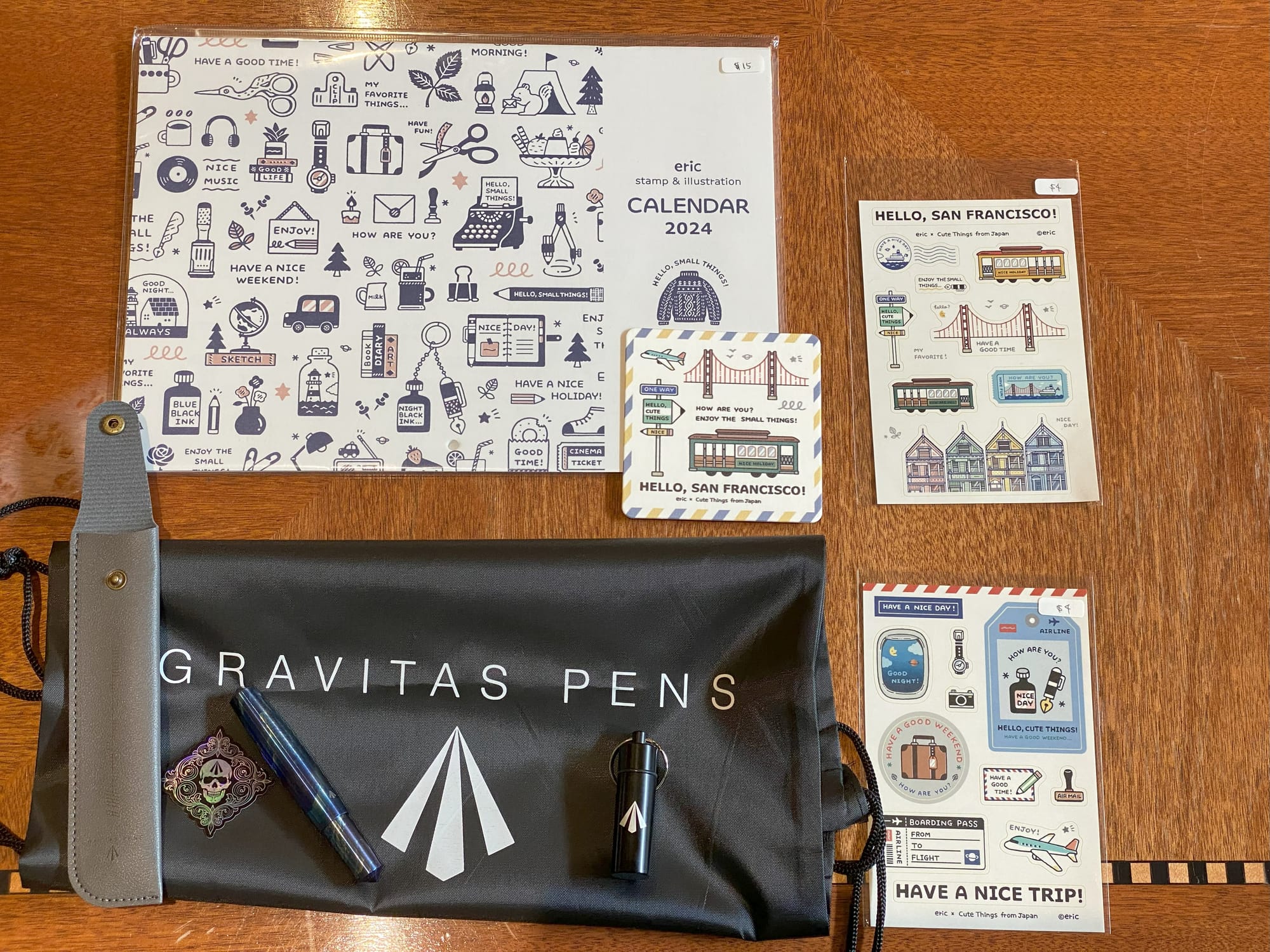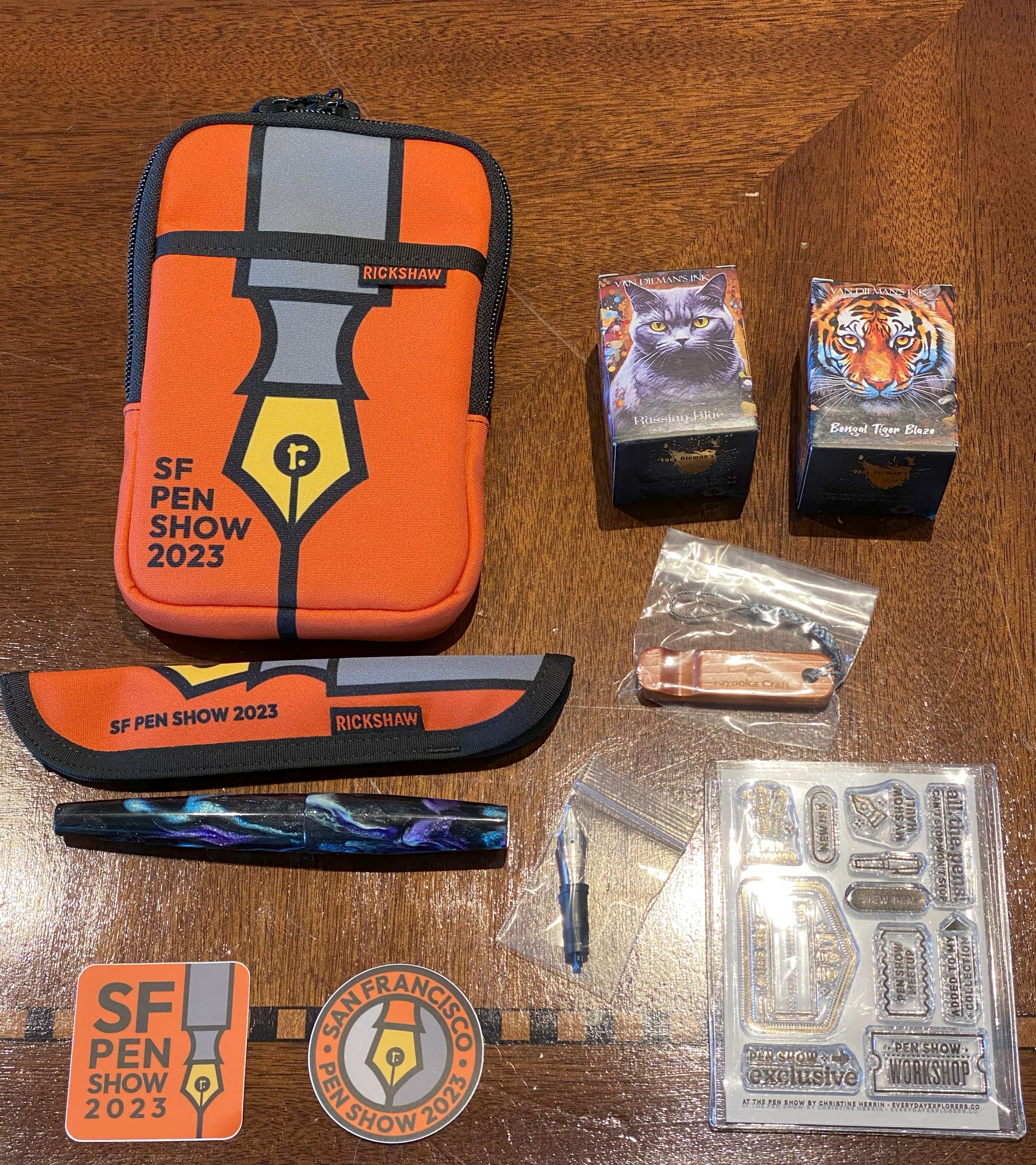 SF Pen Show purchases laid out on a table in the Westin's hotel lobby: Eric Small Things calendar, coaster, and sticker sheets themed for the SF pen show; Gravitas Pocket Pen, sleeve, sticker, drawstring nylon bag and keeper keychain; Rickshaw Bags orange SF Pen Show pen sleeve, coozy case, and stickers, Skogsy Pens Cholla pen, Pen Realm engraved nib, Everyday Explorers Co clear stamps, Toyooka Craft pen rest, and Van Dieman's Feline series inks, Russian Blue (with a Russian Blue cat on the box), and Bengal Tiger Blaze (with an orange tiger on the box)