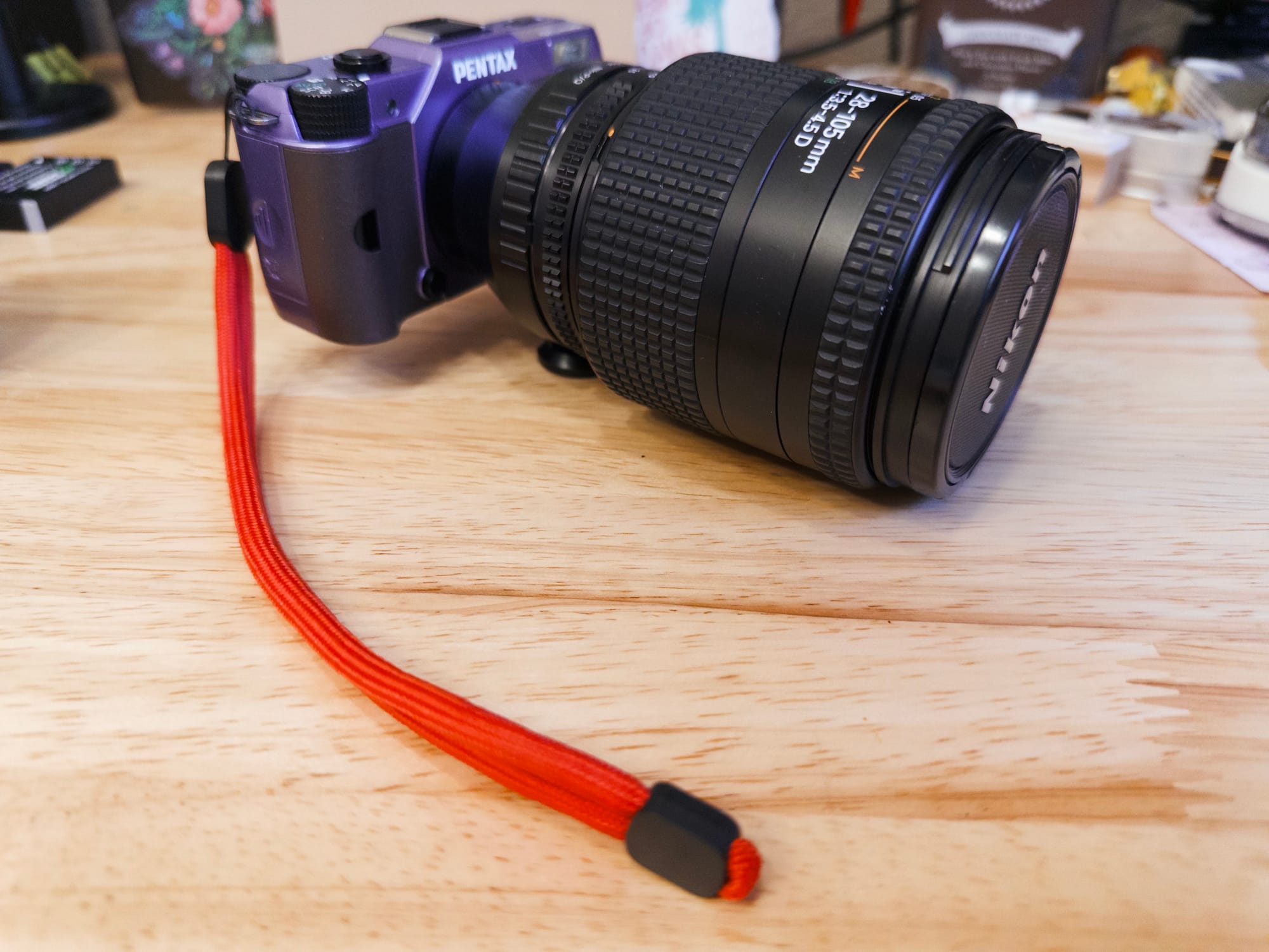 Yes, this lens and camera combo is truly ridiculous-looking, but I don't care! (the red wriststrap is from my Polaroid Go) The Q10 is actually floating, since the lens adapter is wider than the camera body and is sitting on its tripod mount. 😆