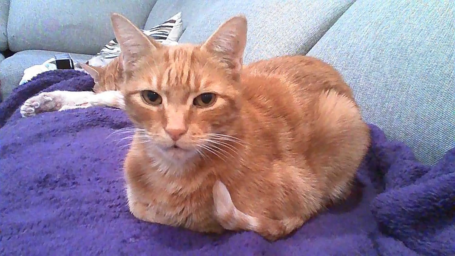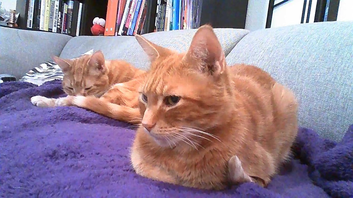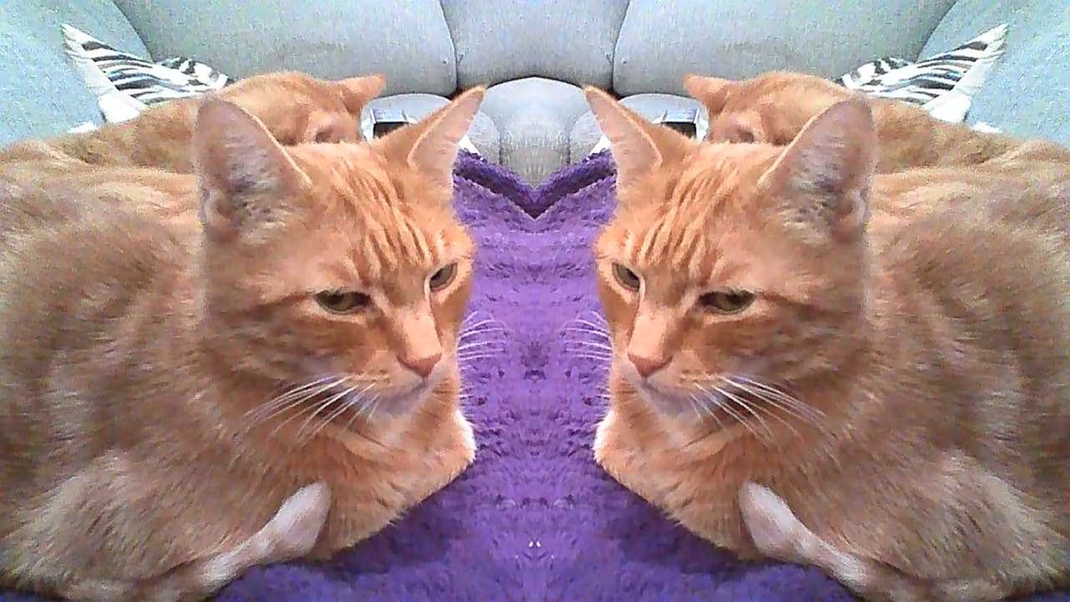 Low-res, widescreen aspect ratio images of orange tabby cats sitting on a purple blanket on a gray couch, with the 3rd image being a "special effect" shot with horizontal mirroring