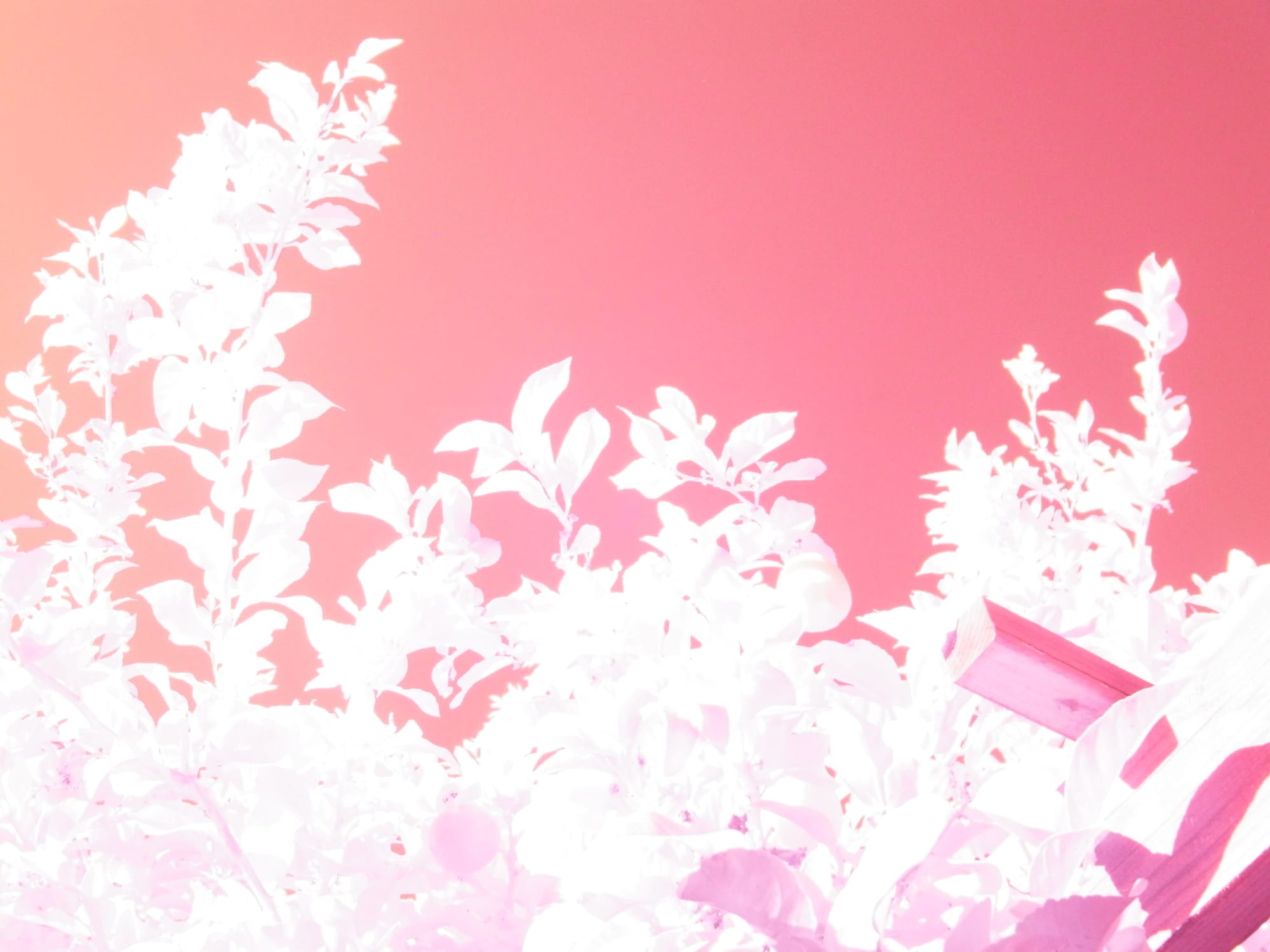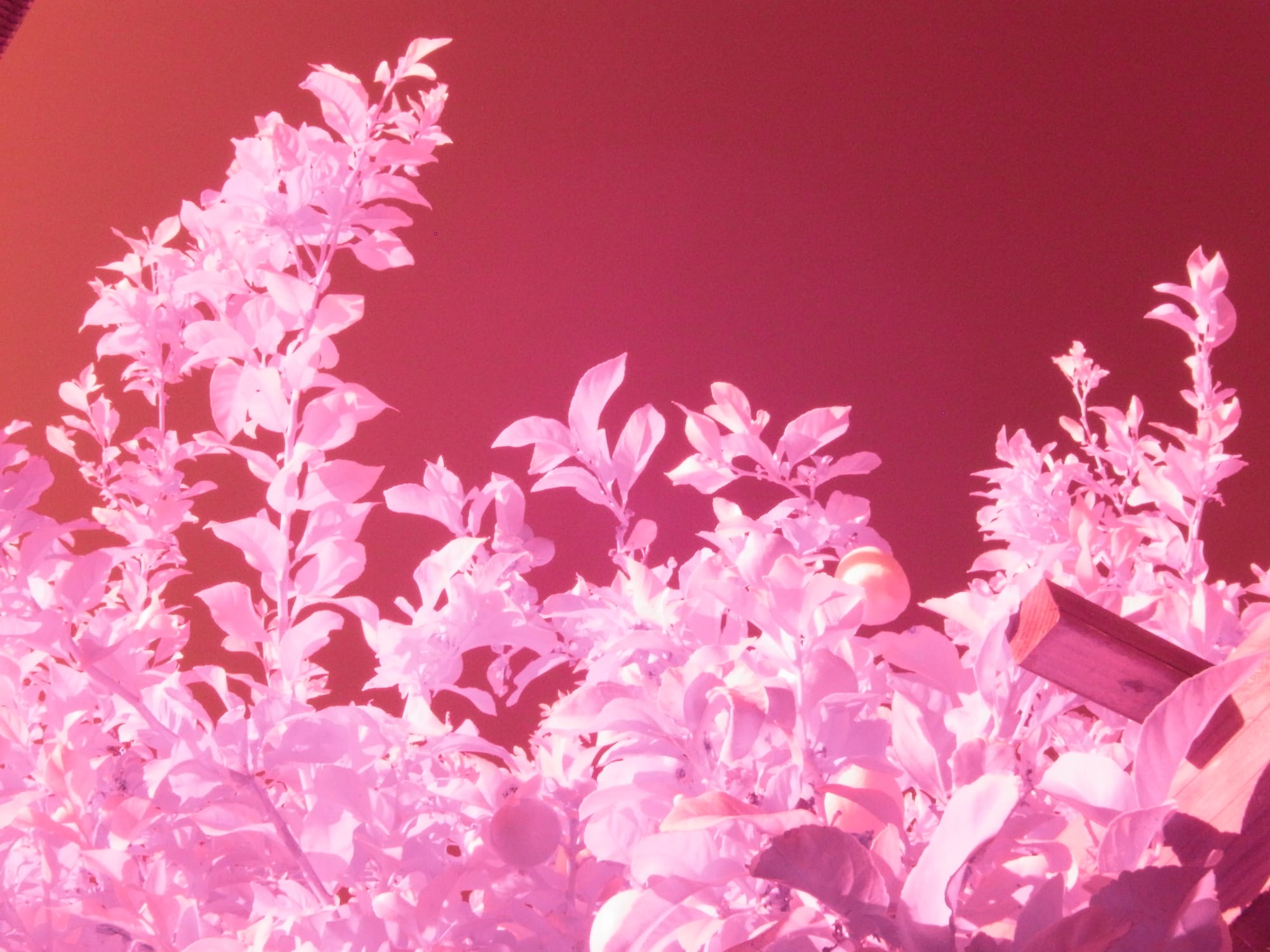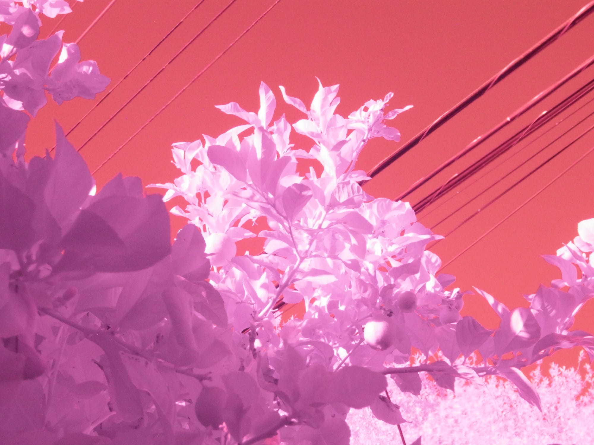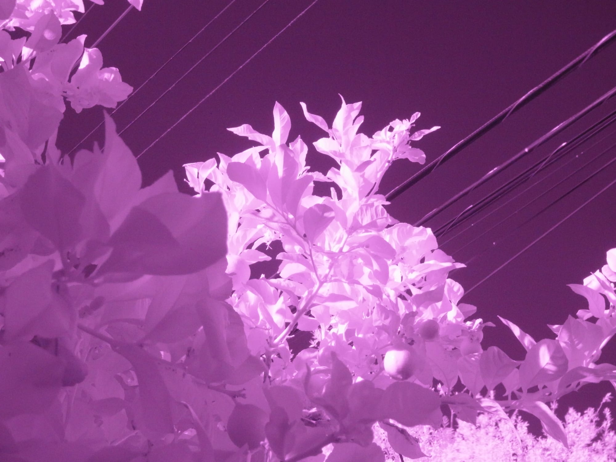 All straight out of the camera, no edits. The top row shows lemon tree branches against a clear sky at different IR wavelengths (purpley, overexposed orange-reddish, and better exposed reddish); bottom row, first two pictures show orange tree branches against clear sky with power lines in the background at two different IR wavelengths (purpley, orange-red), last picture shows a purpley jade plant in IR