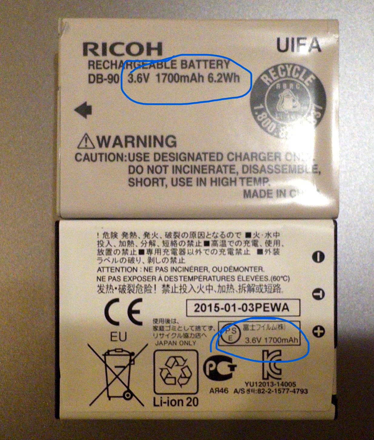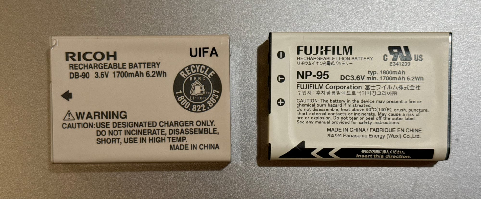 Side-by-side comparison of Fuji NP-95 and Ricoh DB-90 batteries