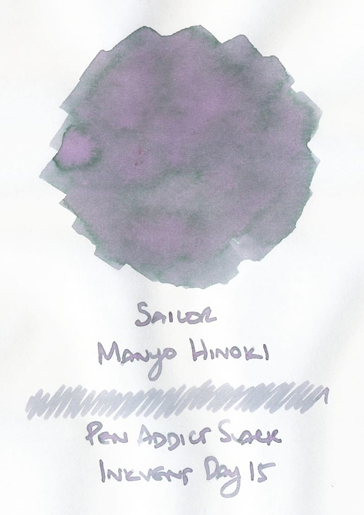Sailor Manyo Hinoki is a magical chromoshading gray. On Tomoe River it appeared a straightforward gray initially, but then the rainbow of colors – green, purple, and pink – came out as it dried, transforming a mild-mannered gray into an opalescent one. I'm definitely looking forward to putting this in a pen.