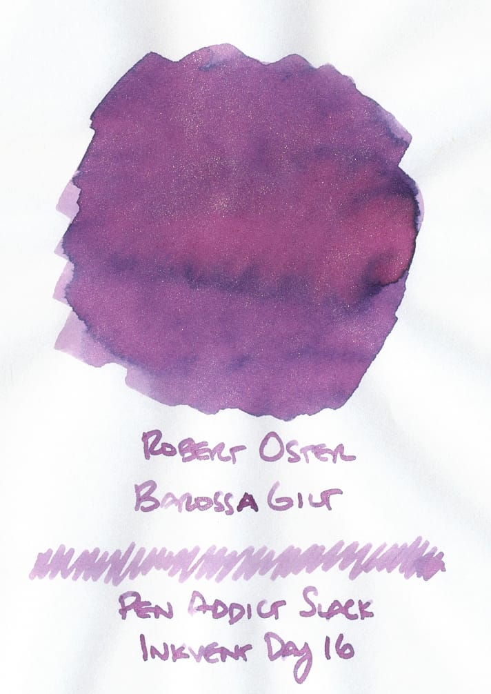 Robert Oster Barossa Gilt is one of those inks that I'd seen swatched somewhere and wanted to get a sample of. It's a pretty violet-blue with gold shimmer, though the shimmer seems muted. It's probably fine since I'm not in much of a mood for shimmer inks, despite it being the holidays. 🤔