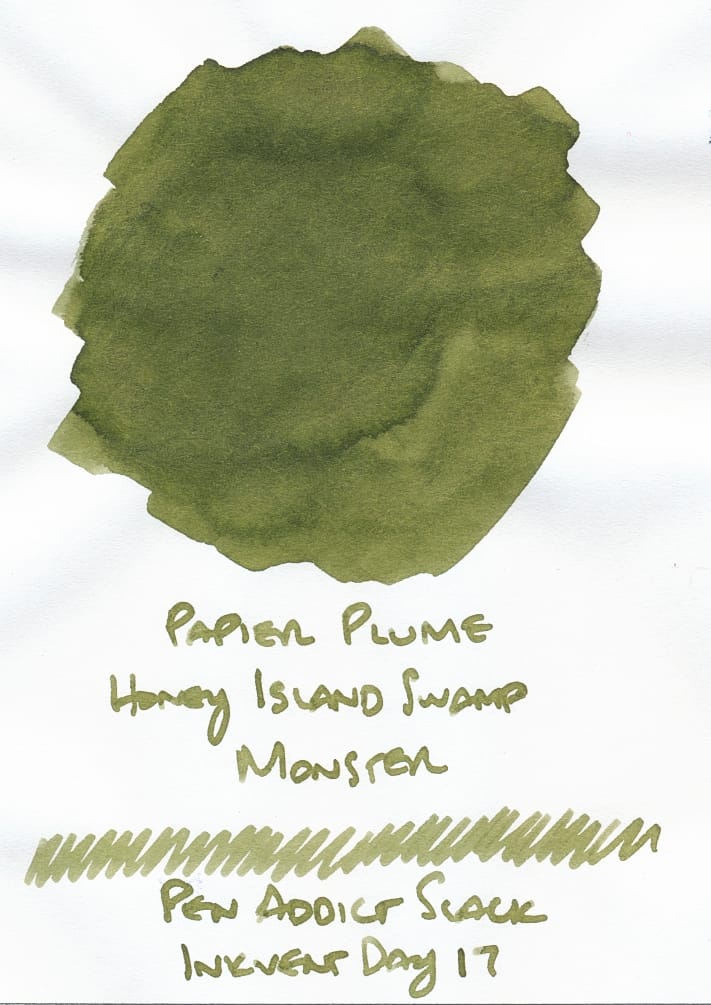 When I opened the sample of Papier Plume's Honey Island Swamp Monster, I was psyched since I'd seen a video about the ink, but hadn't picked up a bottle yet. Of course, it is now sold out. Like my brown inks, this kind of green is a shade I'd liked and had been exploring. Luckily, I think this green looks similar to ones I have (either samples or bottles), like Vinta Leyte, or Troublemaker Hanging Rice. I'll have to actually compare their swatches, but these came to mind.