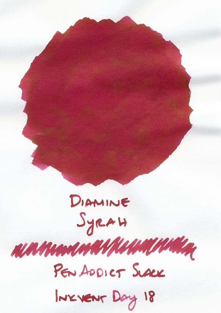 Diamine Syrah was a funny one, because I happened to open another sample of this ink from someone that I'd gotten at an SF Bay Pen Posse meetup last Saturday. Even though it's now a dupe, through no fault of my swap buddy, it's no problem, as it's a very pretty wine red that I'm interested in seeing from different nibs.