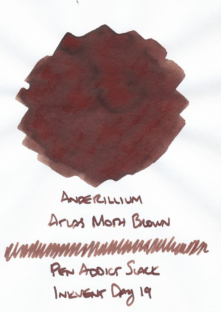 Finally, Anderillium Atlas Moth Brown is a fun brown, because the base shade looks chocolaty, but in areas of heavier pooling, it becomes a redder brown, and has a darker chocolate brown outline. Very interesting swatch to analyze, but you won't get the breadth of those colors in regular writing. Not sure if you would even with a really wet, broad nib, but it's possible.