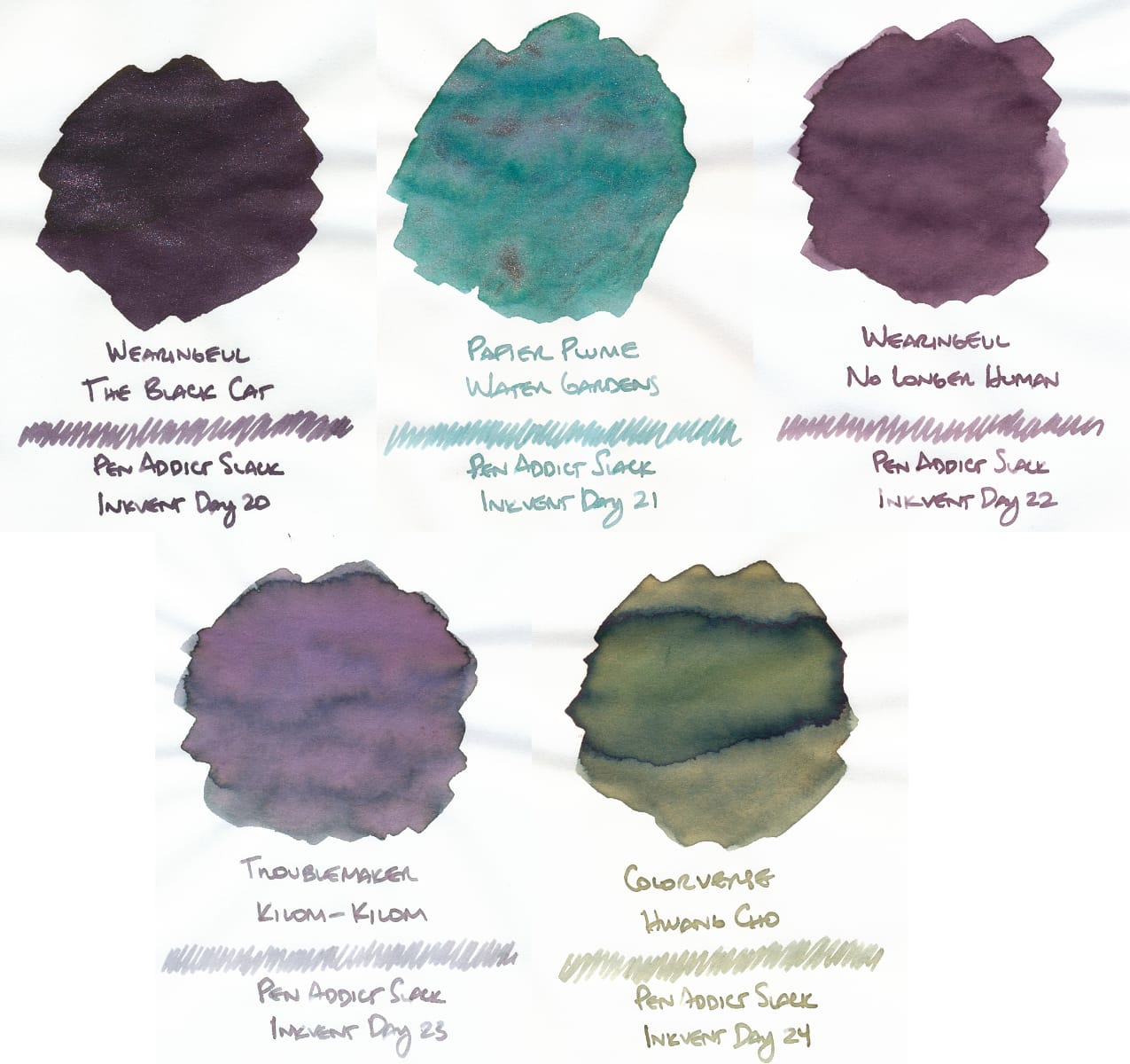 Here's my post for the last 4 days of "Slackvent" (see previous posts for more context: 1, 2, 3), including my overall thoughts on the collection. Firstly, a hearty thank you again to my ink swap buddy! She did an awesome job of selecting these inks and gave me double the prescribed number. 🤩 More thoughts on that later.